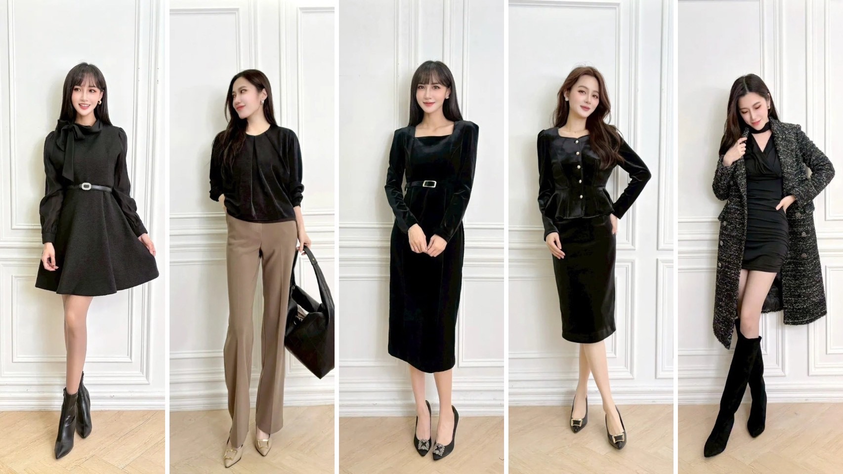 天鵝絨質感低調奢華,加上珍珠釦細節,讓黑色不單調,穩重中蘊藏著女性力量。
