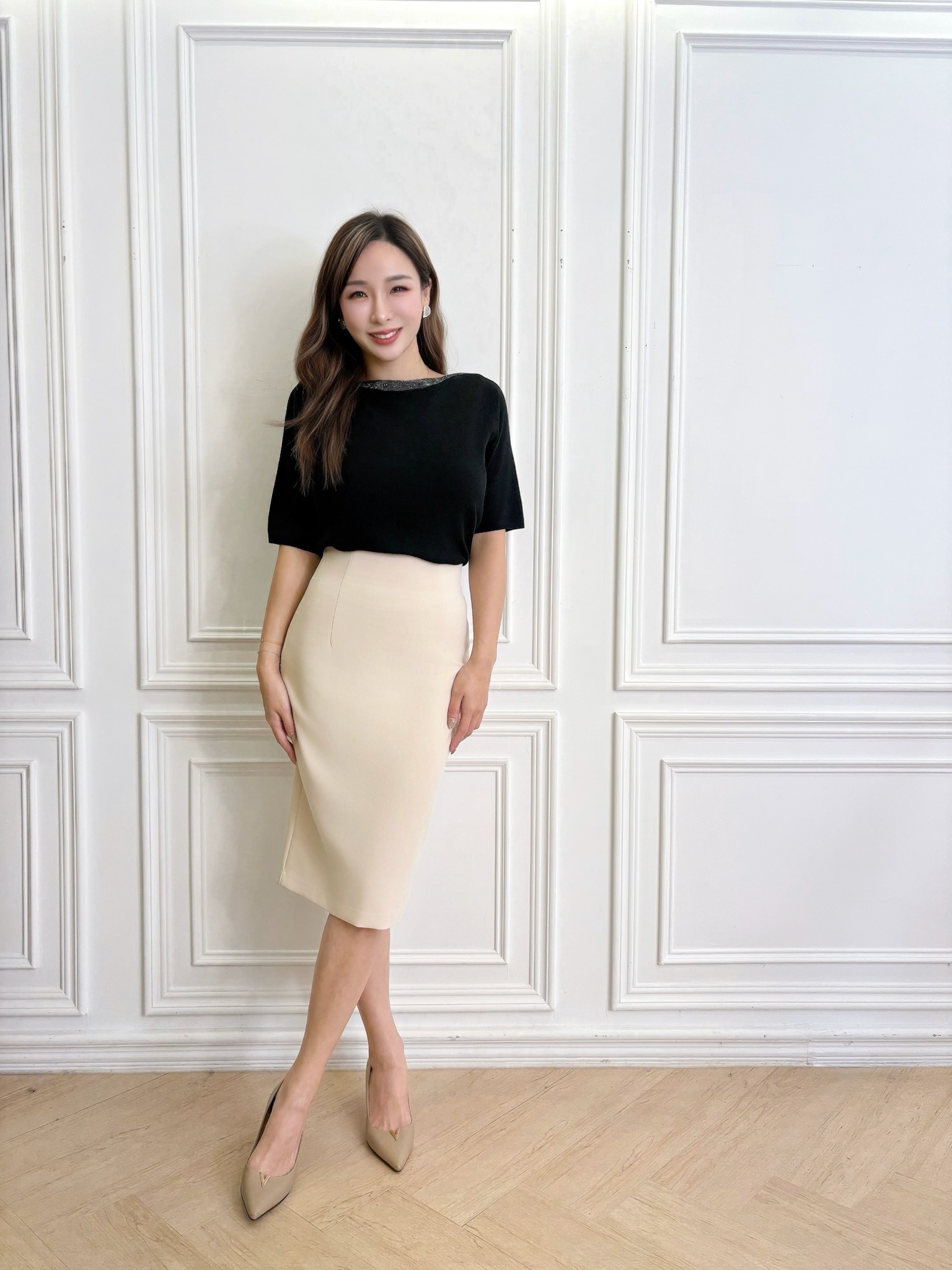 米白色 x 修身窄裙,柔和高級感 🌾
